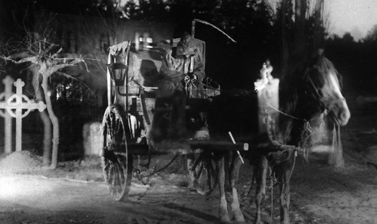 Car l'un des attraits principaux pour le public de 1921, et c'était souvent noté par la presse, c'est l'utilisation savante et abondante, dans cette histoire qui dresse des passerelles entre le monde des morts et celui des vivants, de surimpressions pour montrer le passage de la charrette du passeur des morts. Et si tout le monde s'extasie en 1921, certains commentateurs n'ont as attendu pour dénoncer un recours systématique au trucage, qui empêchait au film d'accéder à la noblesse! Parmi les plus critiques, il y avait Bardèche et Brasillach, ces deux collaborateurs, dont on se demande encore pourquoi leur histoire du cinéma, vue par le tout petit bout d'extrême droite de la lorgnette, faut encore autorité chez certains! Mais si en effet le film a souvent recours à ce trucage, il le fait parce qu'il était nécessaire à Sjöström de rendre immédiatement compréhensible par le public, donc VISIBLE, la différence entre le corps des mortels, et l'âme des défunts. La sur-impresson devient donc un raccourci saisissant, et qui fonctionne en plein. Autre grief (et on n'en attendait pas moins de deux historiens, l'un qui a été fusillé à la Libération, l'autre qui a fait partie des inspirateurs du Front National, parti français fasciste d'inspiration xénophobe), La charrette fantôme est accusé d'être dégoulinant de bons sentiments... Encore une fois, avant de dire n'importe quoi, considérons le film.