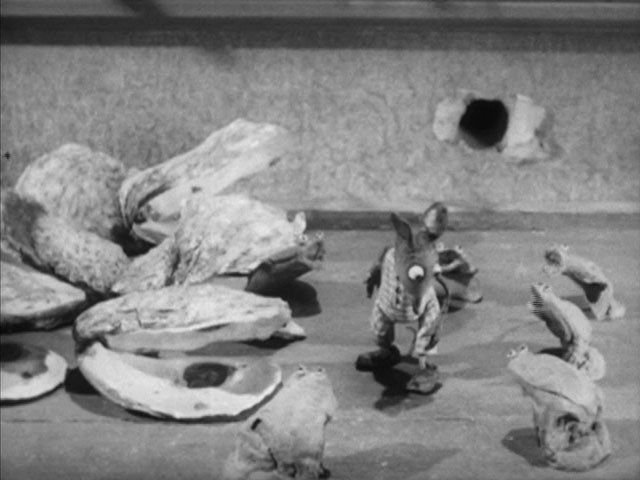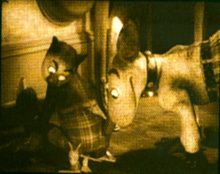 Donc, le film est en volume avec des marionnettes dessinées par Bowers, qui sont tellement plus séduisantes que les animaux empaillés utilisés par Starewicz... Il raconte un conflit larvé entre un chien et une famille de rongeurs qui vivent dans la même maison. Je n'ai pas la moindre idée de ce que les dialogues peuvent bien raconter, et tant pis: il y a un sens du détail, une vie dans ces marionnettes, qui vaut le voyage... Et comme dans tous ses films, Bowers a un don pour l'utilisation d'objets récupérés qui soulignent leur statut, comme un pied de nez envoyé à tous les professionnels du cinéma qui sont moins rigolos que lui...