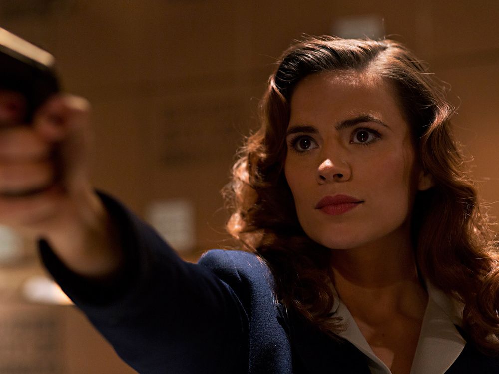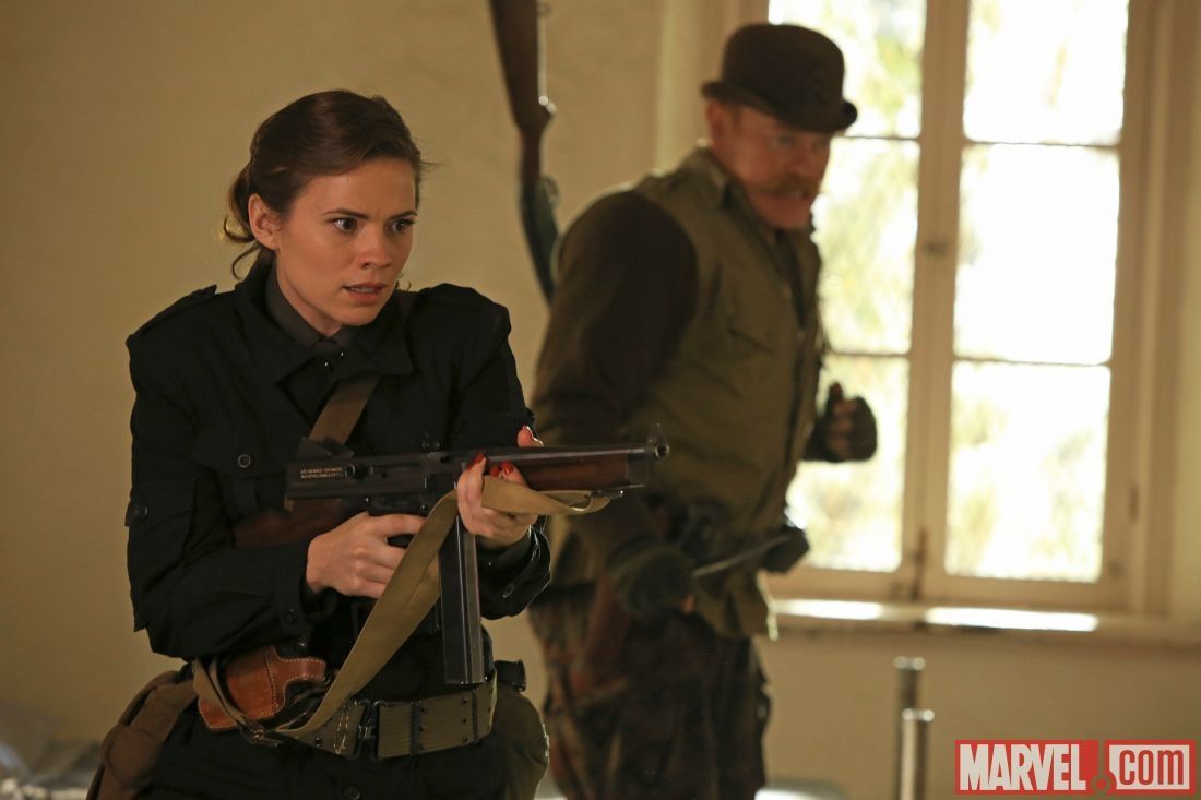 Mais ce qui nous occupe ici, c'est l'autre série: là où Agents of S.H.I.E.L.D. est traitée comme une série classique, se déroulant sur 22 épisodes par saison (A l'instar des séries mythiques de Joss Whedon, Buffy the vampire slayer et Angel), Agent Carter a été crée pour boucher un trou: durant la trève hivernale de Agents of S.H.I.E.L.D., ABC s'est saisie de l'occasion pour diffuser les huit épisodes de ce petit retour en arrière, basé bien sur sur le final de Captain America, the first avenger, réalisé par Joe Johnston. On se rappelle (Si on a vu le film, bien sur) que Captain America y est porté disparu pour l'Amérique de 1945, lors de son naufrage au Pôle Nord, alors qu'il est en liaison radio avec sa petite amie, l'agent Carter, qui l'a guidé et aidé dans ses missions durant le film. C'est de là que part la série, tout comme le court métrage Agent Carter (Dont pour l'instant le script est incompatible avec les événements de la série telle qu'elle existe dans sa première saison) réalisé par Louis D'Esposito en 2012, et qui sert essentiellement de pilote à la série, sans y être inséré. En 1946, nous retrouvons l'Agent Carter (Hayley Atwell, qui reprend son rôle du film), qui est maintenue par les agents du SSR (Strategic Scientific Reserve, cette officine créée dans l'univers Marvel par Roosevelt, et qui développé le programme de "super-soldats" dont Captain America allait découler) dans une condition de subalterne: c'est une femme, elle est donc supposée devoir sa promotion à ses rapports avec Captain America, on ne lui confie pas de missions plus importantes que de classer les dossiers, faire du café, etc... Elle ronge son frein, et va faire une rencontre déterminante: Howard Stark (Dominic Cooper) va en effet être victime d'un coup monté, qui va faire de lui l'ennemi public numéro un. Mais le milliardaire, qui contrairement à tous les hommes qui entourent Carter, se rappelle de la valeur de l'agent Britannique, lui confie la charge de le disculper auprès de ses supérieurs. Comme il est impensable pour les hommes qui entourent la belle brune de lui confier la moindre mission "pour hommes", elle va donc le faire dans l'ombre, aidée de Jarvis (James D'Arcy), le majordome tous terrains de Stark... qui avec sa réserve toute Britannique, aura du mal à se faire aux méthodes musclées de la super-agente.